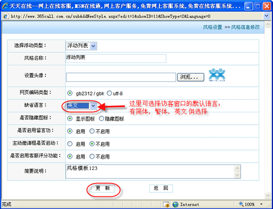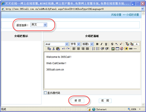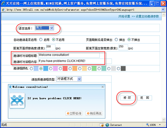 再次點擊“系統(tǒng)設置”->“風格設置”->“主動邀請設置”,彈出主動邀請設置頁,在“語言選擇”選擇要設置的語言種類,輸入完畢信息后,點擊“修改”按鈕: |