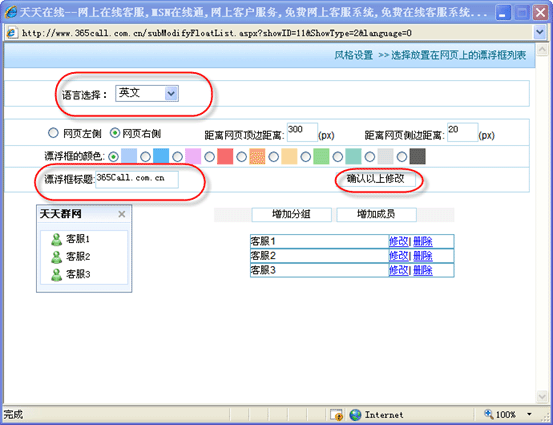 然后點擊“系統(tǒng)設置”->“風格設置”->“客服圖標設置”,彈出客服圖標設置頁,“語言選擇”欄選擇需要設置的語言,“漂浮框標題”欄輸入需要設置的該語言的標題,然后點擊“確認以上修改”: |
