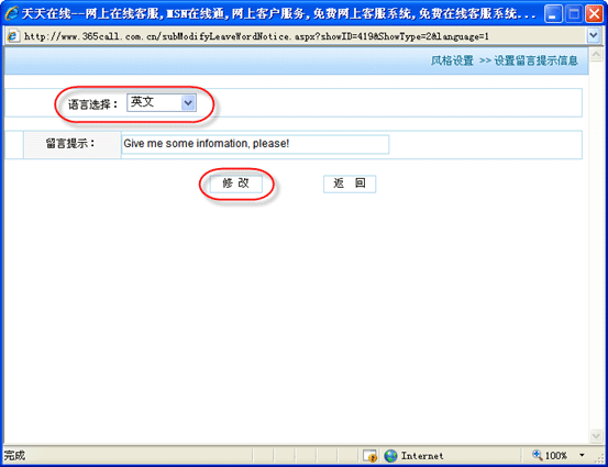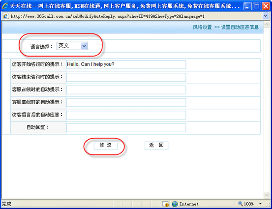 再次點擊“系統(tǒng)設置”->“風格設置”->“自動應答”,彈出自動應答信息設置頁,在“語言選擇”選擇要設置的語言種類,輸入完畢信息后,點擊“修改”按鈕: |
