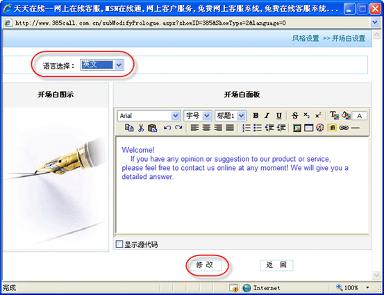 再次點擊“系統(tǒng)設置”->“風格設置”->“開場白設置”,彈出開場白設置頁,在“語言選擇”選擇要設置的語言種類,輸入完畢信息后,點擊“修改”按鈕: |