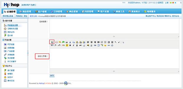 獲取在線客服安裝代碼,然后登陸Hishop后臺(tái),進(jìn)入店鋪管理》網(wǎng)店基本設(shè)置,找到“自定義頁尾”,點(diǎn)擊“HTML代碼”按鈕,把在線客服代碼復(fù)制粘貼到編輯框,點(diǎn)擊保存。